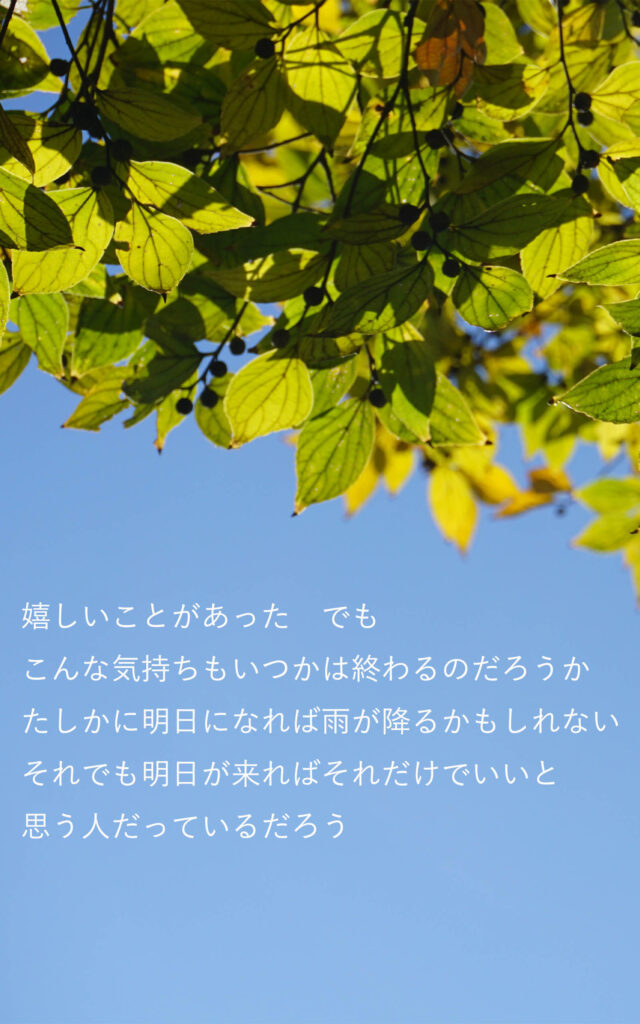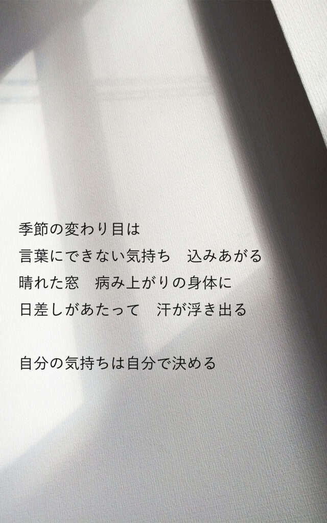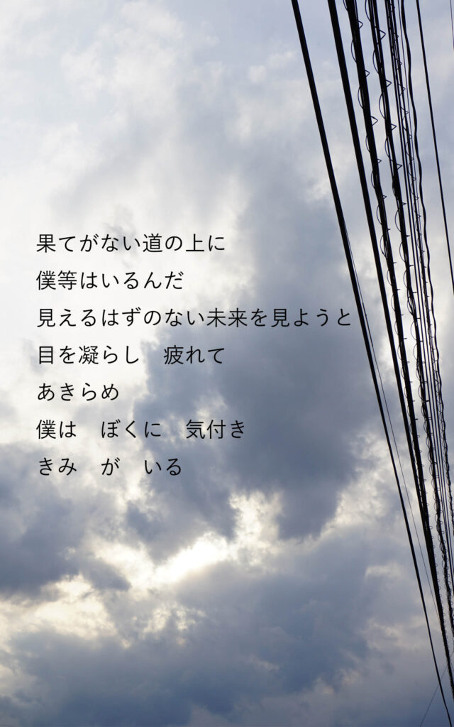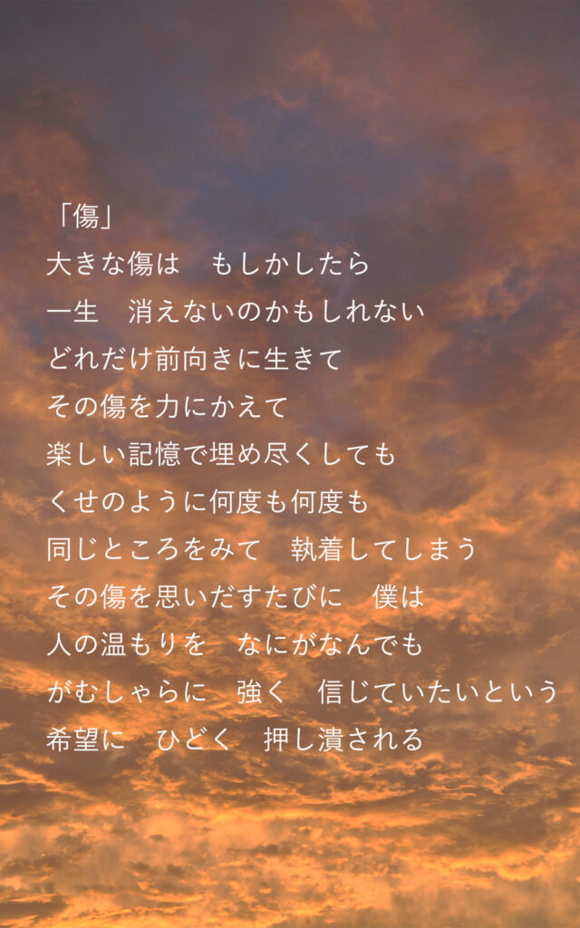 【作品集 ♯1】25歳の詩 2025 10/02 2025年10月2日 当ページのリンクには広告が含まれています。 ようこそ、詩の個展会場へ。 詩-ポエム- 25歳の詩 よかったらシェアしてね! URLをコピーしました! 【作品集 ♯3】23歳の詩 【作品集 ♯2】25歳の詩 著者 りゅーやん 栃木県在住の35歳。 双極性障害二型(完解済み)・同性愛者。 34年間住んでいた愛媛県から、栃木県に引っ越し、12年間続けた介助の仕事をやめて無職になる。精神安定剤代わりに始めた登山を、毎週続けているうちに、ニュージーランド1300kmのロングトレイルを歩くことができるようになった。フィリピン人の同性パートナーと一緒に生活をしながら、社会の壁を乗り越え、楽しい日々を送るため、人生をサバイバルしている。 関連記事 【作品集 ♯3】24歳の詩と抽象画(秋) 2025年9月27日 【作品集 ♯2】25歳の詩 2025年10月3日 【作品集 ♯3】25歳の詩 2025年10月4日 【作品集 ♯1】23歳の詩 2025年9月29日 【作品集 ♯2】23歳の詩 2025年9月30日 【作品集 ♯4】24歳の詩と抽象画(冬) 2025年9月28日 【作品集】35歳の詩 2025年10月8日 【作品集 ♯1】24歳の詩と抽象画(春) 2025年9月25日 コメントが欲しくてたまりません、どうかコメントを…!! コメントする コメントをキャンセルコメント ※ 名前 メール サイト 次回のコメントで使用するためブラウザーに自分の名前、メールアドレス、サイトを保存する。