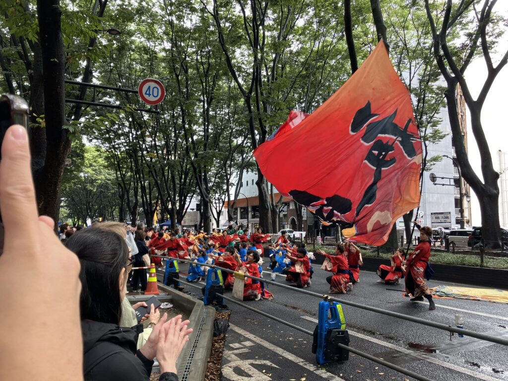 歩道の人の少ないところまで歩き、そこで立ち止まり様子を見てみると、「青森、北海道、山形…」など、日本のいろんなところから踊りの団体がやってきていて、それぞれ通りを練り歩きながら、音楽に合わせて踊りを踊っている。