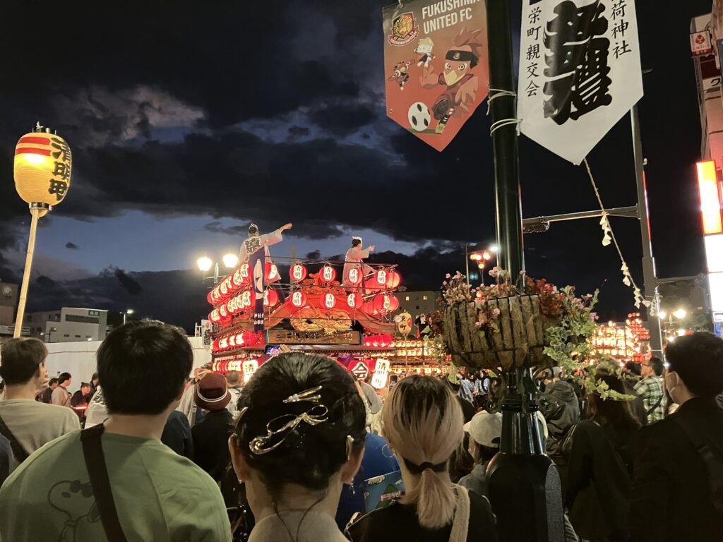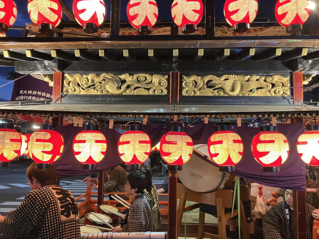 提灯をいっぱい掲げた祭りの神輿が、たくさん並んでいて、神輿の中から太鼓を叩く音や祭りの音楽が聞こえる。