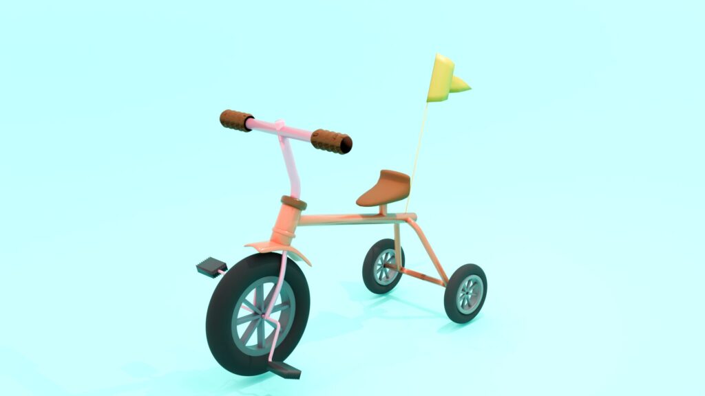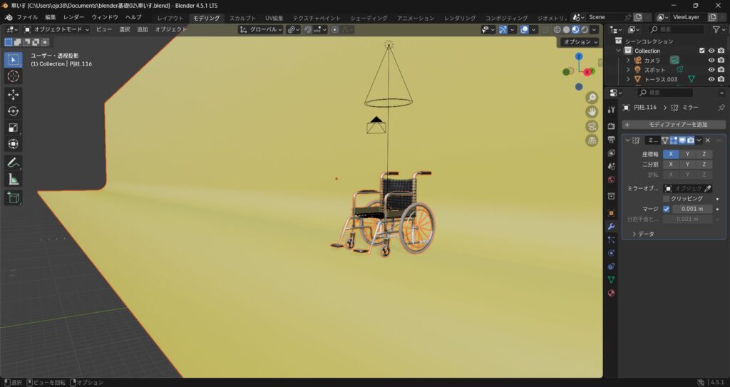こんなふうに、つくった車いすに色つきの背景を加えて、ライトをセットし(強さも自分の好みで合わせ)、カメラの画角も自分でセットし、写真を撮る(=レンダリングする)。